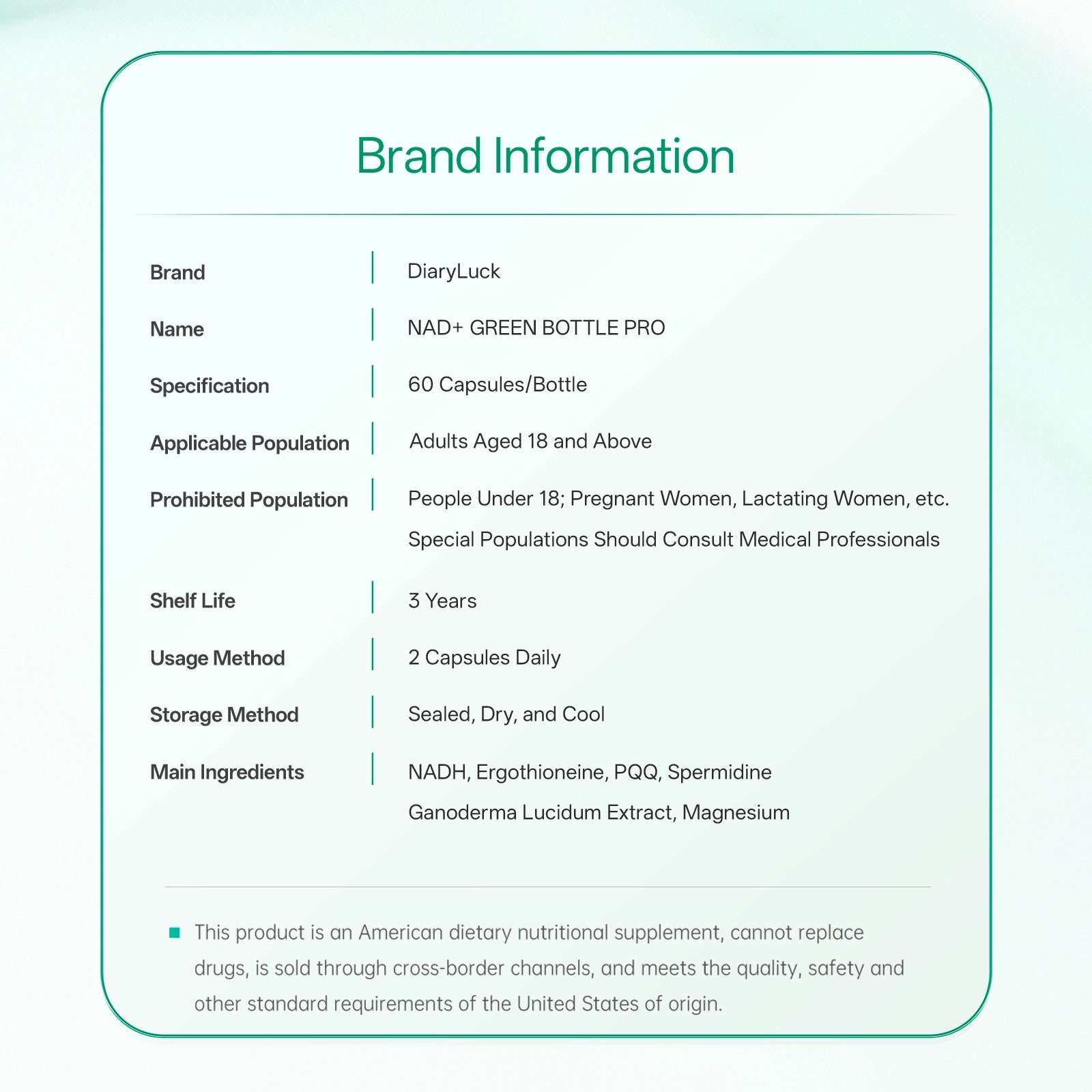 Diaryluck Advanced NAD+ Revita Capsule is precision-engineered for systemic age reversal, delivering a powerful, lab-crafted formula in a convenient two-capsule daily serving that provides 60mg of NADH, 50mg of Ergothioneine, 20mg of PQQ, 20mg of Ganoderma lucidum extract,10mg of Spermidine, and 300mg of Magnesium for comprehensive cellular renewal and energy support. Each capsule is rigorously tested for purity and potency, ensuring a premium and trustworthy anti-aging solution you can take with confidence.